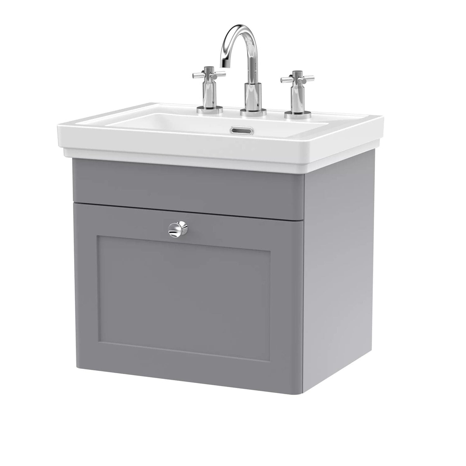 Part of the beautifully crafted Leighton collection from Aquarius Bathrooms, this 500 mm wall mounted vanity unit with basin draws inspiration from the grandeur and refined detailing of traditional English stately homes. Classic styling is blended with modern functionality, creating a timeless piece that suits both period and transitional bathroom designs.